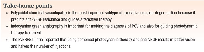 PCV is the most impactful subtype of exudative AMD because it provides a marker for anti-VEGF-resistance, which may affect therapeutic planning for treatment-naïve eyes as well as eyes responding poorly to anti-VEGF therapy. Combination PDT/anti-VEGF therapy can significantly decrease treatment burden and improve anatomic and visual outcomes.