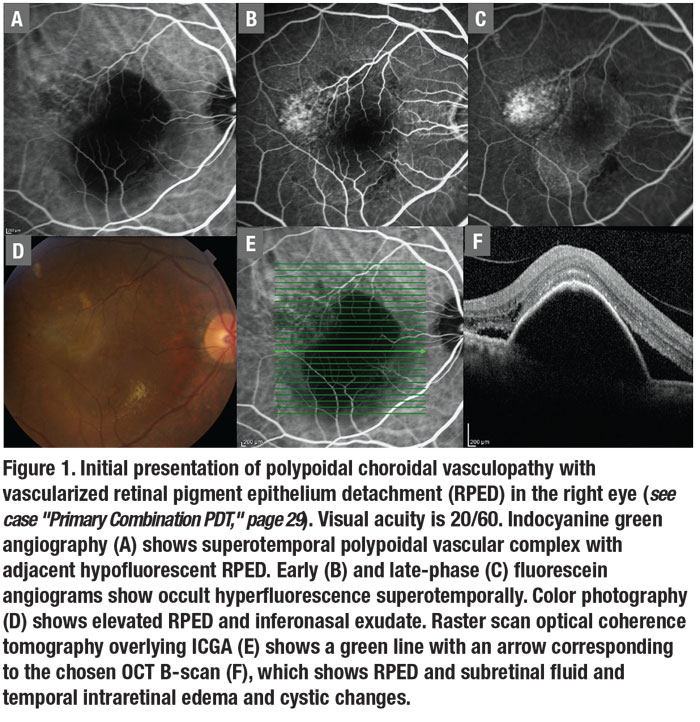 However, unlike with typical exudative AMD, the PCV diagnosis can’t be purely based on fundus examination or fluorescein angiography.7 FA in PCV for most cases shows occult leakage or occult CNV often associated with RPED (Figure 1 B, C).