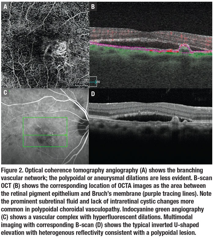 ICGA has been the gold standard for diagnosing polypoidal subretinal aneurysmal lesions in the subretinal neovascular complex,7,10,18-20 and SLO ICGA has greater sensitivity than digital fundus camera ICGA.10 However, if ICGA isn’t available, the diagnosis can be made using an imaging modality that has high specificity but lower sensitivity than ICGA. OCTA images the BVN well, although aneurysmal or polypoidal lesions are less discerning due to slower blood flow within the polypoidal lesions (Figure 2).21-22
