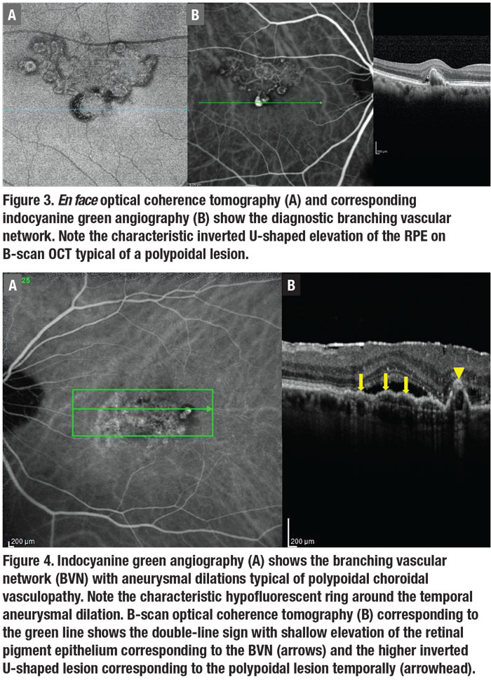 associated with PCV anatomically (Figure 3).21,23-24 But, again, it’s less sensitive than ICGA. B-scan OCT is the most available diagnostic modality in most practices, and shows fluid and blood associated with the polypoidal lesions.21-22 The polypoidal lesions most diagnostic of PCV appear as inverted U-shaped lesions with heterogeneous reflectivity, while the BVN appears as a shallow elevation of the RPE above Bruch’s membrane (double-line sign).4