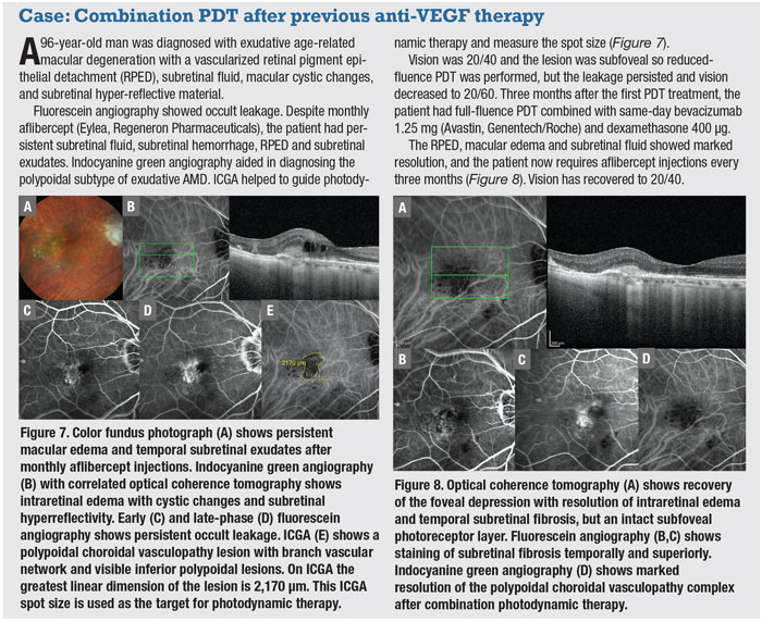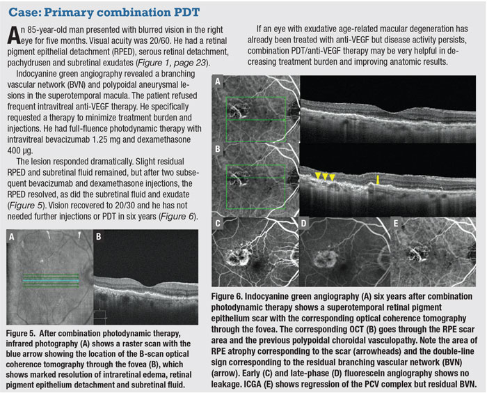 In addition to primary combination therapy of PDT and anti-VEGF therapy, eyes treated initially with anti-VEGF but with a poor response may have a better outcome with less treatment burden when subsequently treated with combination PDT.19 (See case examples on pages 29 and 30.)