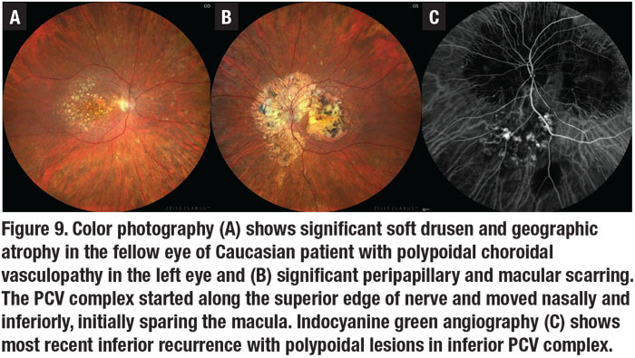 PCV was initially described as a peripapillary disease in Caucasian and Black patients and often bilateral.9 More recent studies in Caucasians showed that PCV primarily affects the macula.26 In Caucasians with unilateral disease, significant drusen and geographic atrophy can present in the fellow eye (Figure 9A), and peripapillary disease provides a characteristic peripapillary scarring around the nerve (Figure 9B), which doesn’t usually occur in Asian patients with this disease.