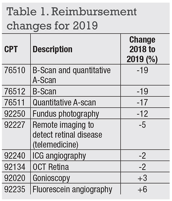 The 2019 rates for surgical procedures, including intravitreal injections, vitrectomy procedures and lasers, remained within 1 percent of 2018 rates. The exception is a 19 percent reduction to CPT 67515, “Injection of medication or other substance into Tenon’s capsule.”2 Office visit codes commonly used by retina specialists, including 99205, 99215, 99204, 99214, 92004 and 92014, also remained within 1 percent of the 2018 rates.