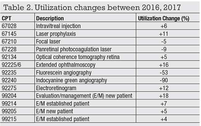 Some noteworthy changes in select services that ophthalmologists provide to Medicare beneficiaries occurred between 2016 and 2017. While Medicare does not report “Retina only” data, retina specialists provide many of the services listed in Table 2, which shows the percentage of change in volume from 2016 to 2017.