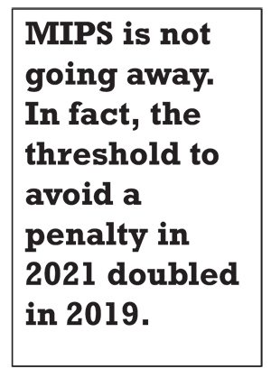 The CMS Quality Payment Program (QPP) made several changes in 2019. The most noteworthy is an increase in the performance threshold to avoid the penalty for physicians and/or physician groups participating in MIPS. For 2019, the threshold to avoid a penalty in 2021 increased from 15 points in 2018 to 30 points in 2019.7 The range for payment adjustments in 2021 based on 2019 participation increases to +/- 7 percent.8