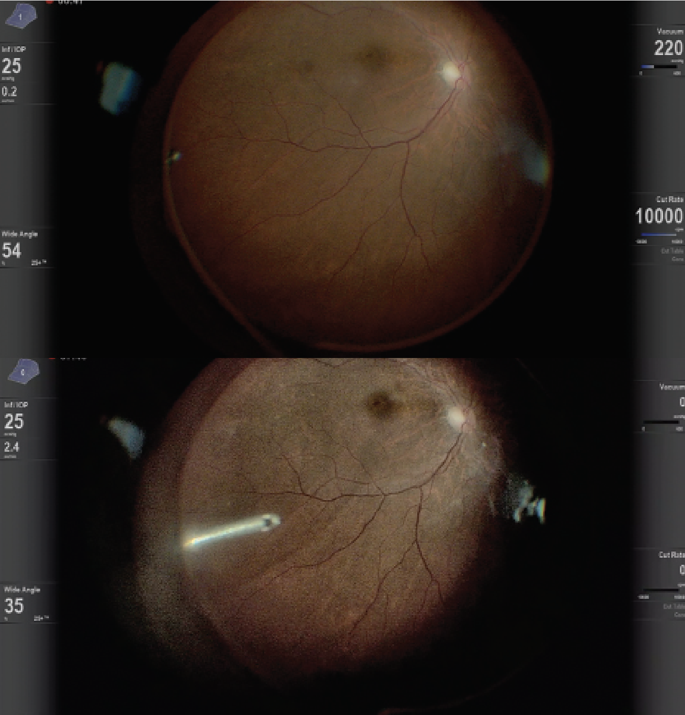 • Gene therapy. 3D HUD can be valuable when performing subretinal gene therapy. The enhanced depth of view and high-resolution display can allow for improved surgical performance especially with subretinal bleb creation and propagation. In addition, as we mentioned, incorporating iOCT on the same display offers advantages. Delivering the gene therapy subretinally is important, but reflux from the retinotomy site or leakage into the intravitreal cavity can occur. This can be subtle in the microscope view, but on 3D HUD the leakage can be seen on the display, often more evident from the shadow of the needle.
