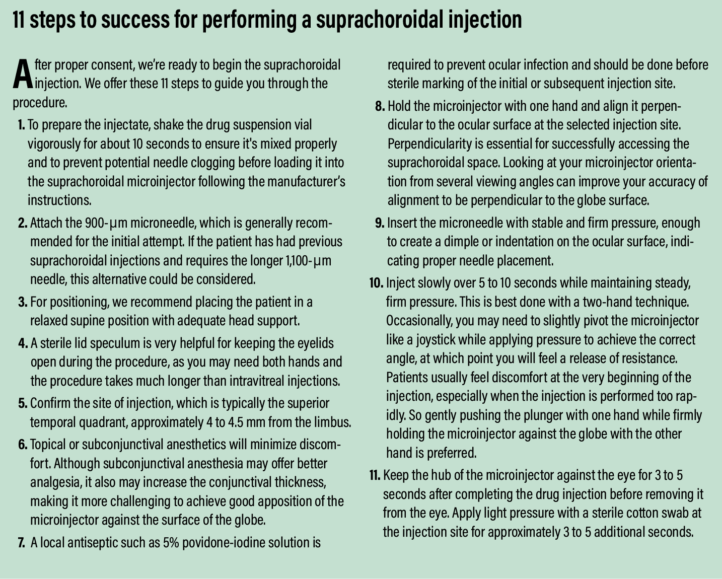 Suprachoroidal injections are a new and innovative technique that may provide improved bioavailability to the posterior pole while minimizing exposure and adverse effects on the anterior segment. Despite the ease of this in- office procedure, the suprachoroidal injection technique requires setting patient expectations, maintaining perpendicular orientation and firm pressure with the microinjector, injecting gently and slowly, and preparing for the need to switch location or needle. Potential applications beyond delivering steroids, including angiogenesis inhibitors and gene therapies, may broaden the scope of suprachoroidal delivery in ophthalmic practice. RS