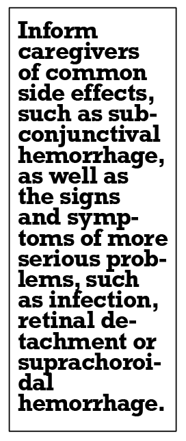 Inform caregivers of common side effects, such as subconjunctival hemorrhage, as well as the signs and symptoms of more serious potential complications, such as infection, retinal detachment or suprachoroidal hemorrhage. Although rare, patients and their caregivers should be aware of them and seek medical attention if concerning symptoms arise.