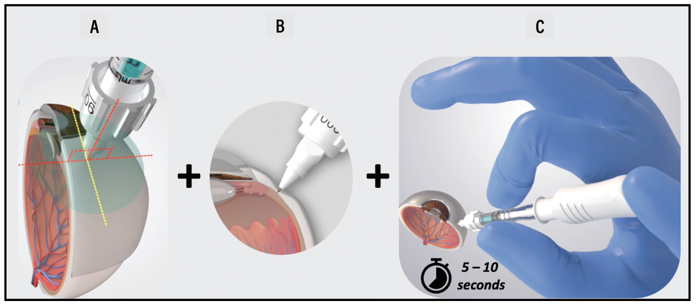 Across clinical trials, the 900-μm microneedle can successfully access the suprachoroidal space on the first injection attempt in 78 percent of patients without the need to measure the scleral thickness.8 For the remaining patients, a second attempt can be made in a different quadrant of the globe or with using a slightly longer 1,100-μm needle.