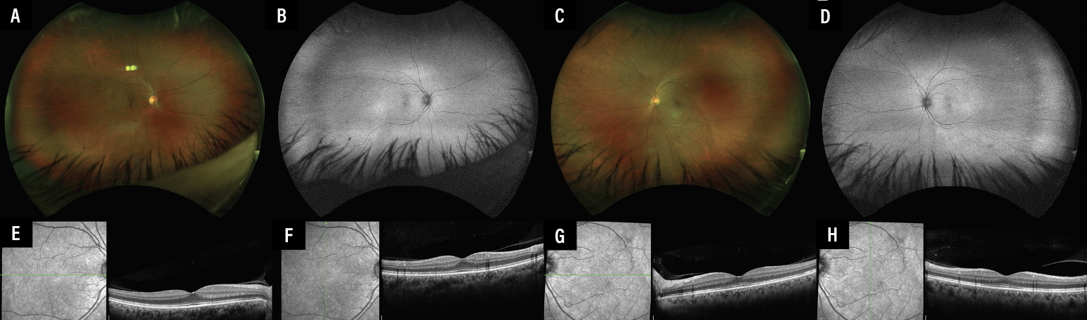 Neither eye had hypopyon, but the left eye had rare vitreous cells. Dilated fundus examination revealed striae radiating from the optic nerve head along with mild blurring of the nasal optic disc margin of the left eye. We noted a macula-sparing serous retinal detachment inferotemporally in the right eye and a macula-involving serous retinal detachment in the left. We didn’t observe any retinal tears on scleral depressed examination.