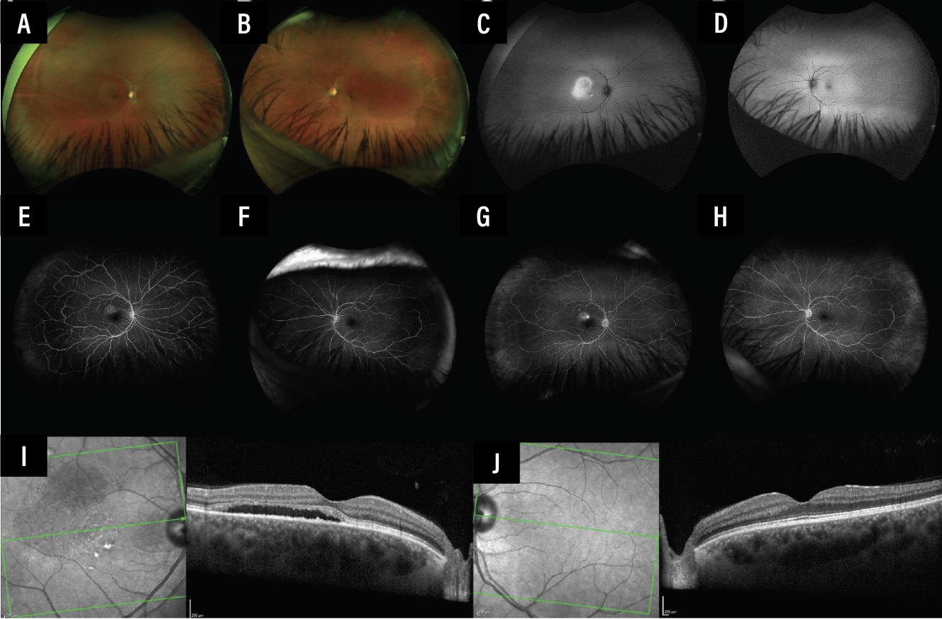 Figure 1. Multimodal imaging of the right and left eye. Pseudocolor fundus photography shows SRF OD (A) and an unremarkable left eye (B). There’s corresponding fundus hyperautofluorescence OD (C) and normal autofluorescence OS (D). FA shows early hyperfluorescence (E) and leakage (G) OD with normal fluorescence appearance OS in early (F) and late phases (H). Of note, in the late-phase fluorescein angiogram of the right eye (G), there is subtle but notable hyperfluorescence in the inferotemporal periphery. SD-OCT reveals SRF with a shaggy ellipsoid zone OD (I) and normal retinal laminations OS (J). |
