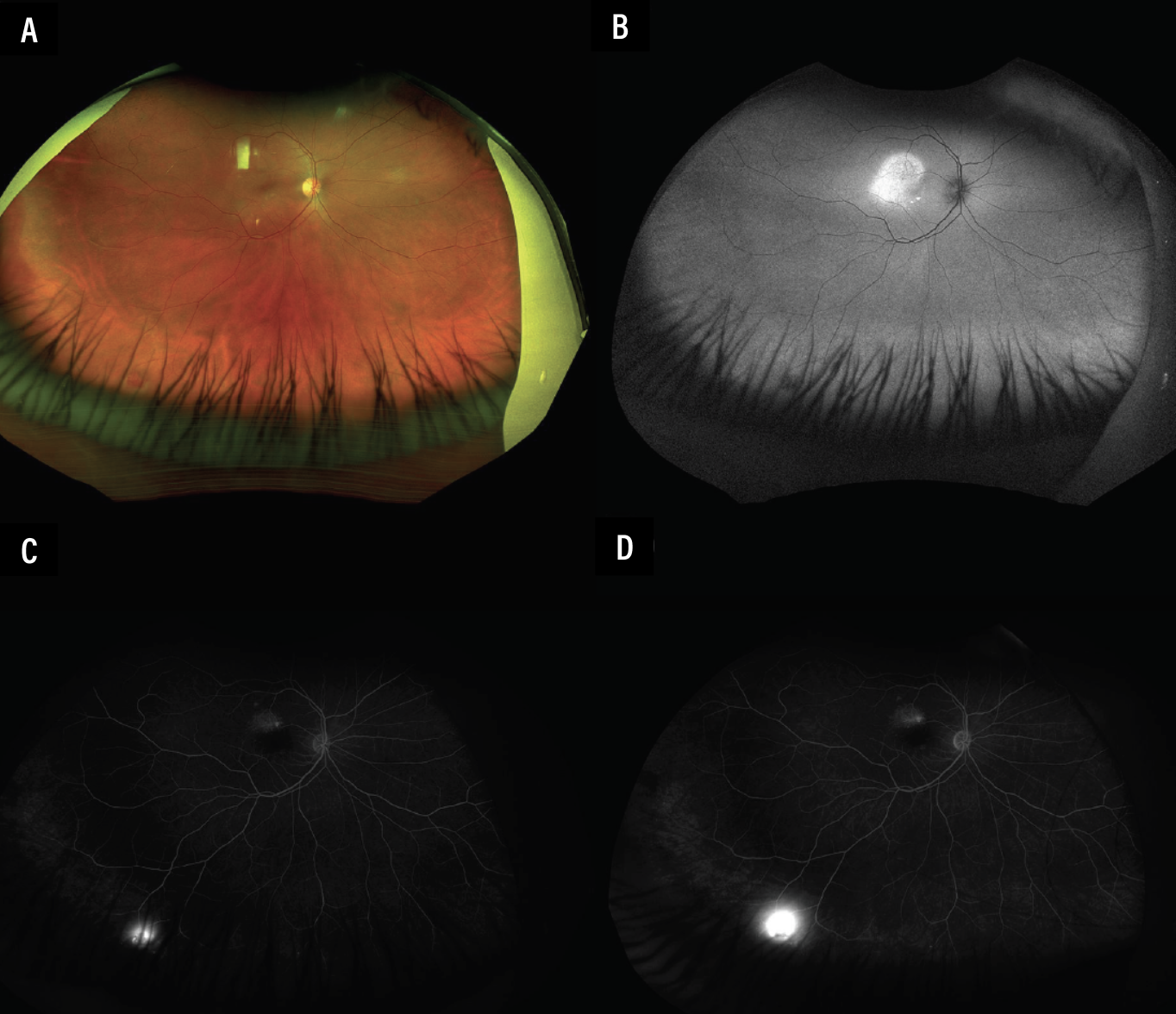 Her presenting visual acuity was 20/20 in both eyes with normal intraocular pressures and pupillary responses. Slit lamp biomicroscopy revealed an unremarkable anterior segment. Dilated fundus examination showed an unremarkable left eye but subretinal fluid in the macula and an orange vascular lesion in the inferotemporal periphery of the right eye. Pseudocolor fundus photography showed SRF in the right macula with a small one-disc diameter vascular lesion in the far inferotemporal peripheral retina (Figures 1A and 2A). There was also hyperautofluorescence corresponding to the region of SRF in the right macula (Figures 1C and 2B). The left eye was unremarkable (Figure 1D).