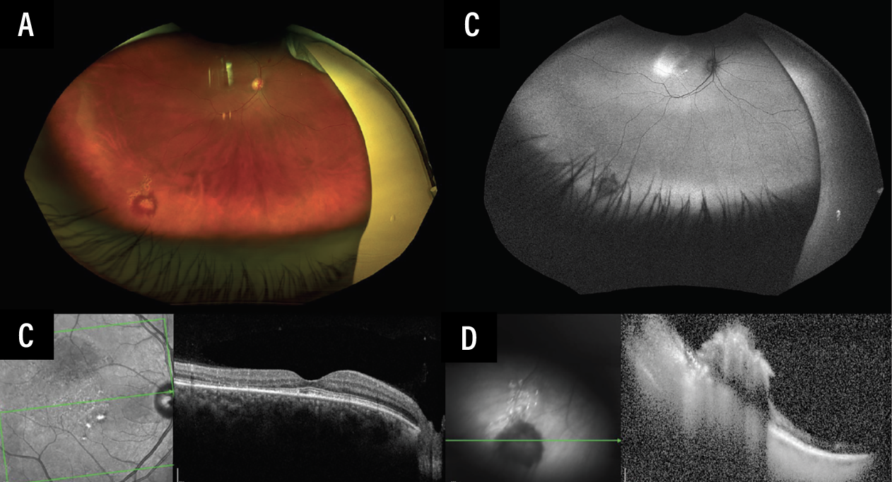 Figure 3. Status-post grid laser photocoagulation over and surrounding the retinal vascular lesion with its feeder arteriole in the right eye. Scanning laser ophthalmoscopy of the inferotemporal periphery OD shows laser over and around the retinal vascular lesion (A). The lesion is surrounded by hypoautofluorescent laser scars (B). SD-OCT through the right fovea shows resolution of SRF with loss of temporal outer retinal layers (C). SD-OCT through the hemangioma reveals findings consistent with an elevated retinal vascular lesion (D). |
