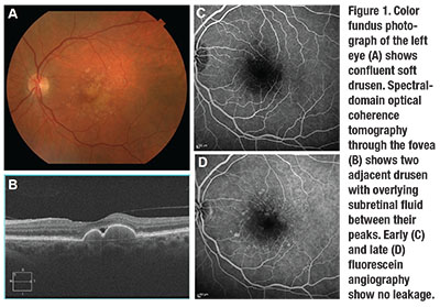 before her visit. Visual acuity was 20/25 in the left eye, and a fundus exam revealed confluent soft drusen (Figure 1).