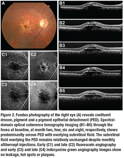 A 72-year-old man presented with blurred vision in his right eye. VA was 20/100 in the eye. A fundus exam revealed confluent drusen, pigment and a PED (Figure 2). SD-OCT imaging revealed a predominantly serous PED with overlying subretinal fluid.