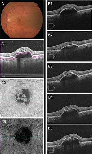 | Figure 3. Color fundus photography of the left eye (A) demonstrates central pigment epithelial detachment with adjacent drusen. Spectral-domain optical coherence tomography images at the fovea (B1–B5) at baseline, and months five (after five aflibercept injections), 13 (after three more injections), 20 (after two more injections) and 26 (after three more injections), respectively, show the size of the PED and overlying subretinal fluid remain relatively unchanged. SD-OCT angiography does not show any sign of neovascularization (C1-C3). |