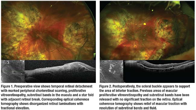 remained elevated because of contraction of the preretinal membranes and subretinal bands within the macula. We determined the retinal detachment was due to an atrophic break near a chorioretinal scar in the inferotemporal quadrant.