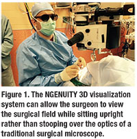 • Surgeon ergonomics. An American Academy of Ophthalmology survey noted high prevalence of neck, upper- and lower-extremity pain in 52 percent of surveyed physicians. Operating with NGENUITY has allowed a more ergonomic posture during surgery (Figure 1), resulting in noticeably less back pain and fatigue at the end of longer operating days.