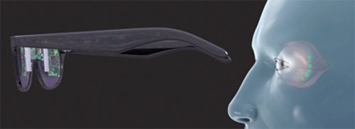 | A conceptual drawing of the Bionic Sight neuroprosthetic device that is built into a pair of glasses or goggles and relays signals to retinal ganglion cells injected with a transgene to restore vision in people with damaged photoreceptors. |