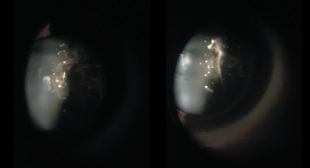 Figure 1. White amorphous material attached to the posterior lens capsule of both eyes demonstrate “glass wool” appearance of the vitreous. |