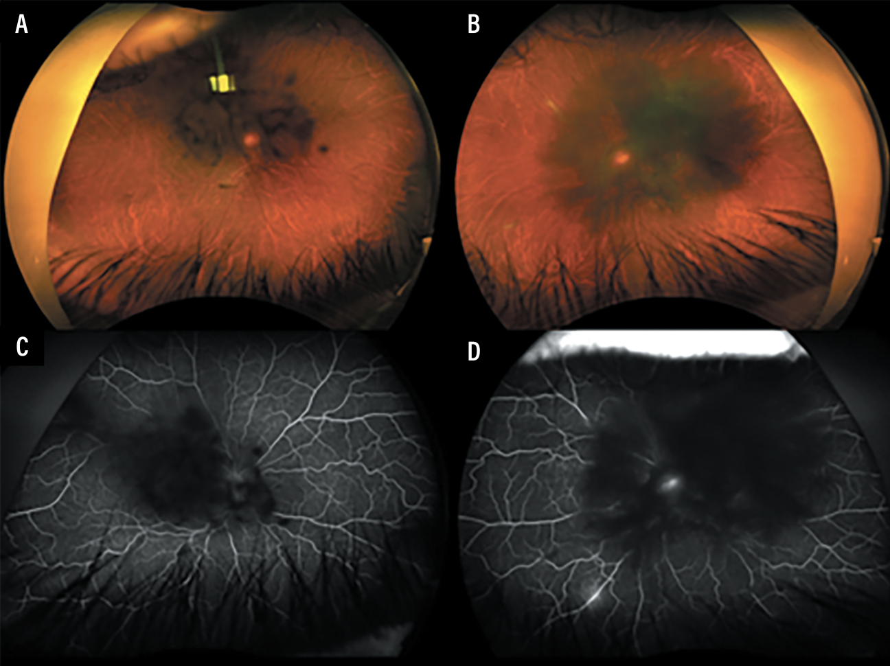 Figure 2. A, B) Fundus photography of the right and left eyes, respectively, demonstrate central vitreous opacities and white deposits along the peripheral blood vessels. C, D) Fluorescein angiography of the right and left eyes captured at around 5 minutes and 30 seconds, demonstrate central blockage from lenticular and vitreous opacities, possible nerve leakage of the left eye and inferior venous leakage. |