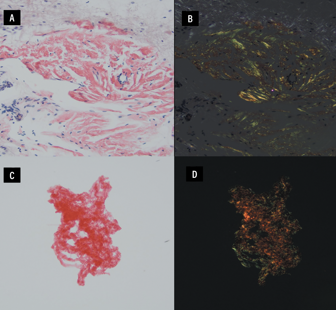 The patient then underwent a diagnostic PPV and conjunctival biopsy of the left eye, which showed Congo red staining of proteinaceous material with apple green birefringence (Figure 3). Liquid chromatography tandem mass spectrometry performed on the conjunctival biopsy revealed a peptide profile consistent with transthyretin type amyloid.