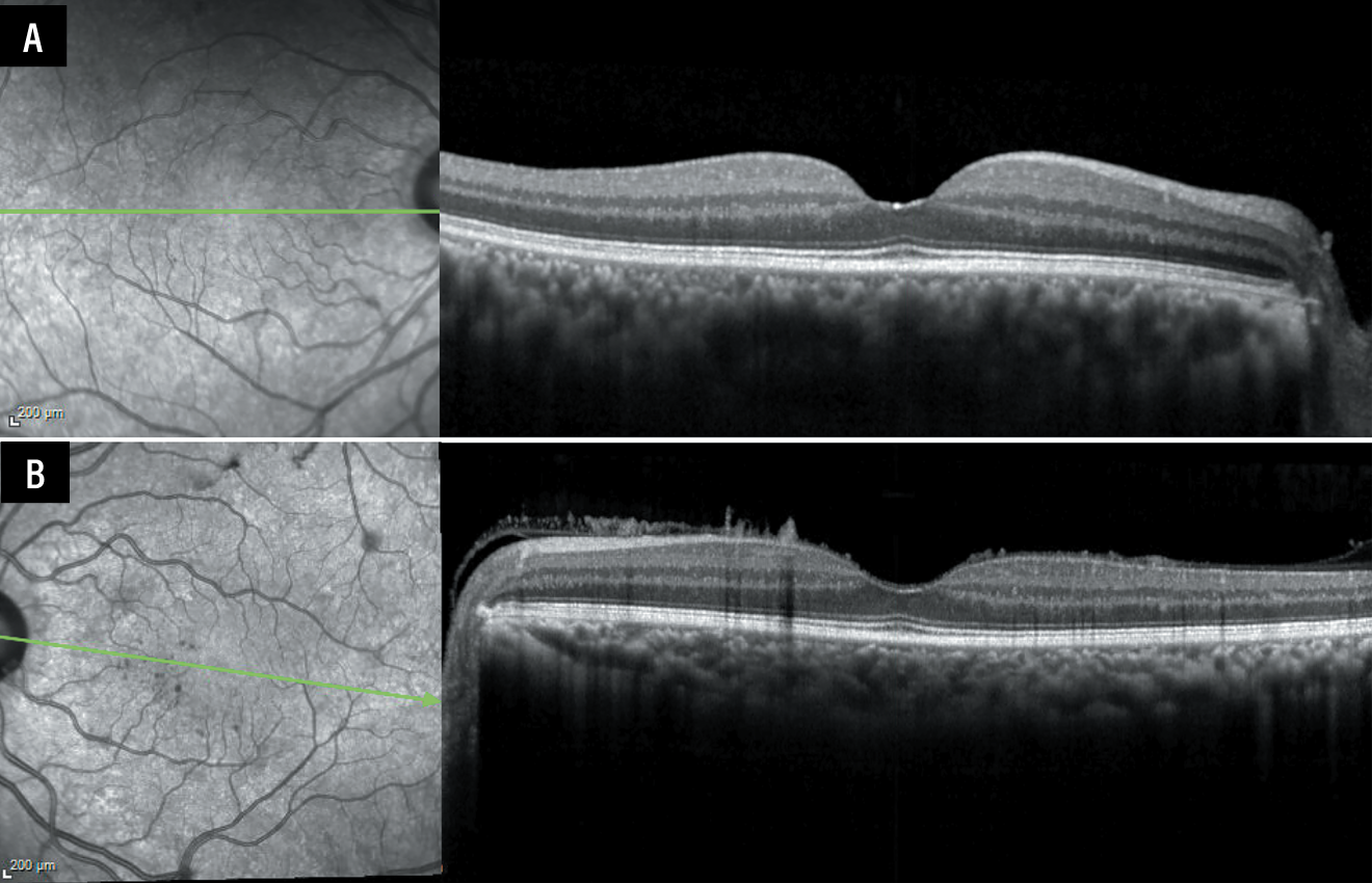 Figure 4. A) Optical coherence tomography of the right eye was unremarkable. B) Imaging of the left eye after pars plana vitrectomy revealed classic needle-shaped deposits on the anterior retinal surface extending into the anterior vitreous. |