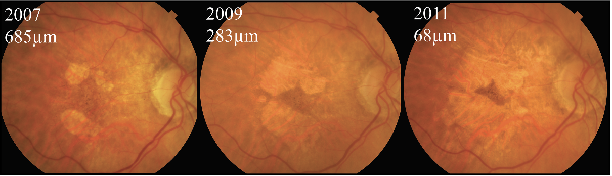| Figure 1. Color fundus photographs showing the progression of extrafoveal geographic atrophy towards the fovea over time. Geographic atrophy proximity (i.e., the shortest distance between the foveal center-point and the nearest pixel of GA) decreased gradually over time from 685 mm (2007) to 68 mm (2011). (This figure was published in: Keenan TDL, et al. Oral Antioxidant and Lutein/Zeaxanthin Supplements Slow Geographic Atrophy Progression to the Fovea in Age-Related Macular Degeneration. Ophthalmology 2025;132:1:14-29. Copyright Elsevier (2025)) |