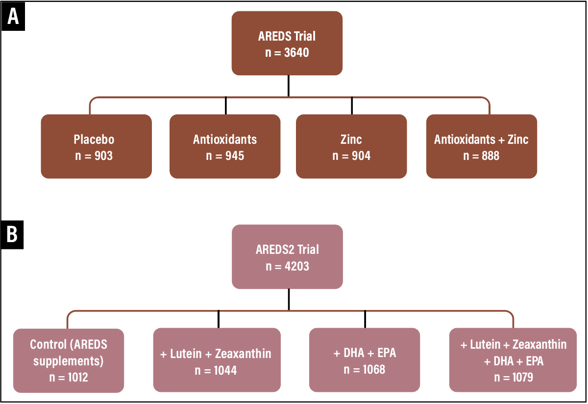 | Figure 2. Randomization schemes. A) Age-Related Eye Disease Study: Participants were randomized 1:1:1:1, using a 2x2 factorial design, to oral antioxidants (vitamin C, vitamin E, and β-carotene) only, zinc only, both antioxidants and zinc, or placebo. B) AREDS2: Participants were randomized, 1:1:1:1, using a 2x2 factorial design, to oral lutein/zeaxanthin only, docosahexaenoic acid (DHA) plus eicosapentaenoic acid only, both lutein/zeaxanthin and DHA/EPA, or placebo. All participants were also offered the original AREDS formulation to take alongside the randomly assigned primary treatment. |