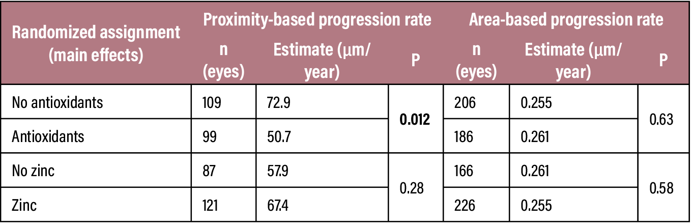The AREDS randomization is shown in Figure 2A. In eyes with extrafoveal GA, for rate of progression towards the fovea, the oral antioxidant component (comprising vitamin C, vitamin E, and beta-carotene) had a significant treatment effect (Table 1).5 Participants randomly assigned to the antioxidants had a progression rate that was 36 percent slower than those randomly assigned to no antioxidants. Interestingly, no significant treatment effect was detected for area-based progression overall, although a beneficial treatment effect was present for the subgroup of eyes with early GA (particularly those with extrafoveal GA). In fact, in that subgroup of eyes with early extrafoveal GA, the rate of visual acuity decline was twice as slow in participants randomized to antioxidants vs no antioxidants. The zinc component had no significant beneficial or harmful effect for either the area or proximity outcome measure.