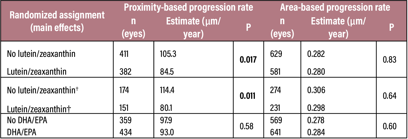 Table 2. Geographic atrophy proximity-based progression and area-based progression in the Age-Related Eye Disease Study 2 (AREDS2), according to randomized assignment. * All participants also assigned to receive AREDS supplements † Considering only those participants in the secondary randomization study population who were randomly assigned to no β-carotene (analyzed because lutein/zeaxanthin and β-carotene compete for intestinal absorption) DHA = docosahexaenoic acid; EPA = eicosapentaenoic acid Bold font: P-value significant at the 0.05 threshold |