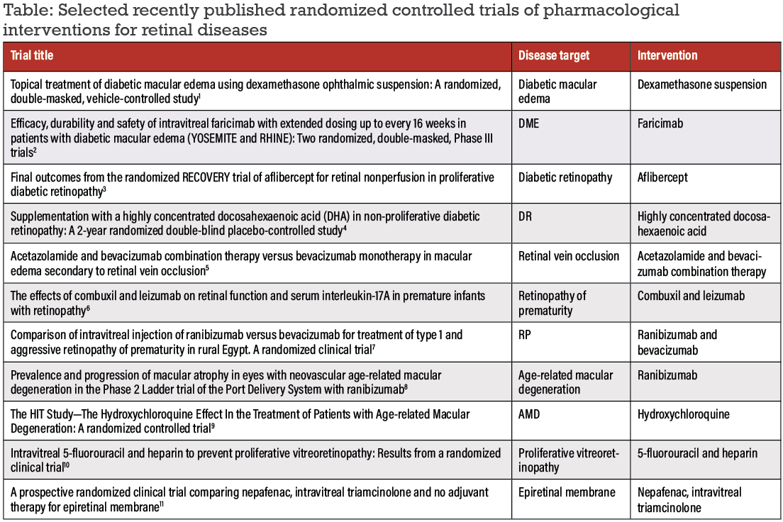 In this past year, many refinements in pharmacological randomized clinical trials in retina have occurred, ranging from delivery modes to treatment regimens. Here, we summarize a selection of the latest published RCTs and ongoing protocols in our space (Table, below).