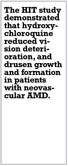Israel, investigated a potential protective effect of hydroxychloroquine (HCQ) against the development of nAMD.9 The study compared visual acuity, CMT and drusen number and size in 110 patients receiving HCQ vs. placebo. The study authors reported reduced visual deterioration, and drusen growth and formation among the treated patients. As such, hydroxychloroquine could be a preventative treatment to change the course of AMD.