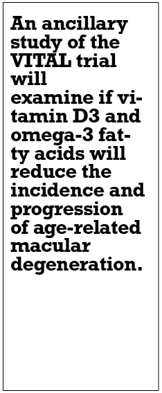 • VITAL trial of vitamin D3 or omega-3 fatty acids in AMD. VITAL stands for VITamin D and OmegA-3 TriaL, which is an ongoing RCT evaluating these two daily dietary supplements and the risk of developing cancer, heart disease and stroke without prior history (NCT01169259).13