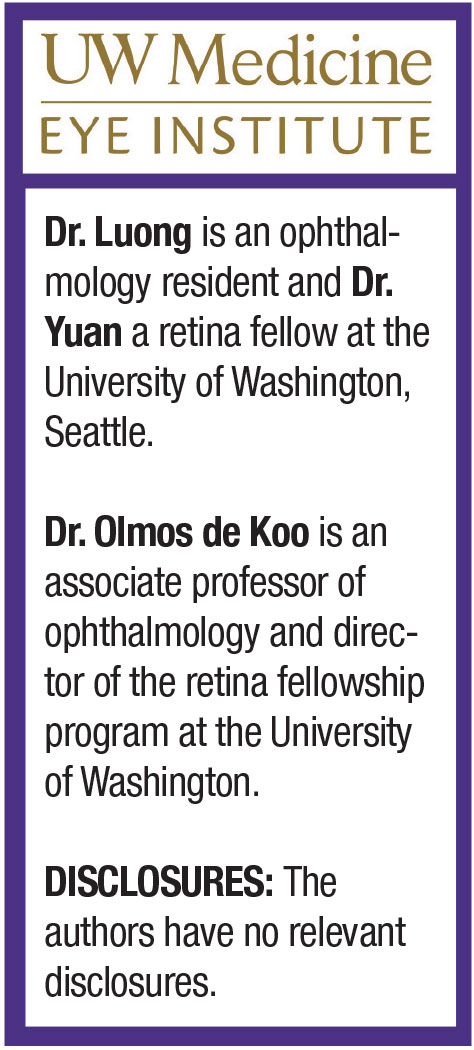 A 56-year-old male physician was referred urgently to the University of Washington retina clinic with a one-week history of a “small blind spot” in the right eye. The scotoma was just superior to fixation with a purple and yellow hue.