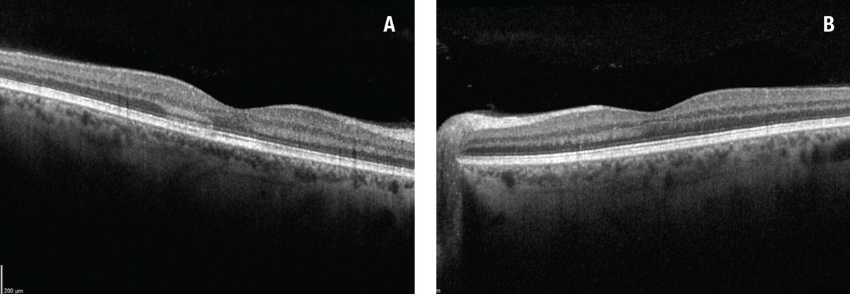| Figure 2. A) Spectral-domain optical coherence tomography of the right eye revealed a focal area of hyperreflectivity within the outer nuclear and plexiform layers along with disruption of the ellipsoid zone. B) SD-OCT in the left eye revealed subtle focal outer retinal thinning and ellipsoid zone granularity nasal to fovea. |