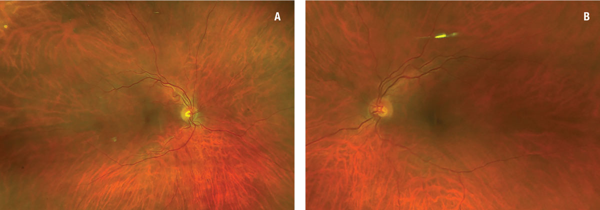 | Figure 1. Fundus photography was relatively unremarkable in both eyes, showing a subtle interruption of the foveal light reflex in the inferotemporal macula of the right eye (A) with an otherwise normal macular and peripheral exam (B). |