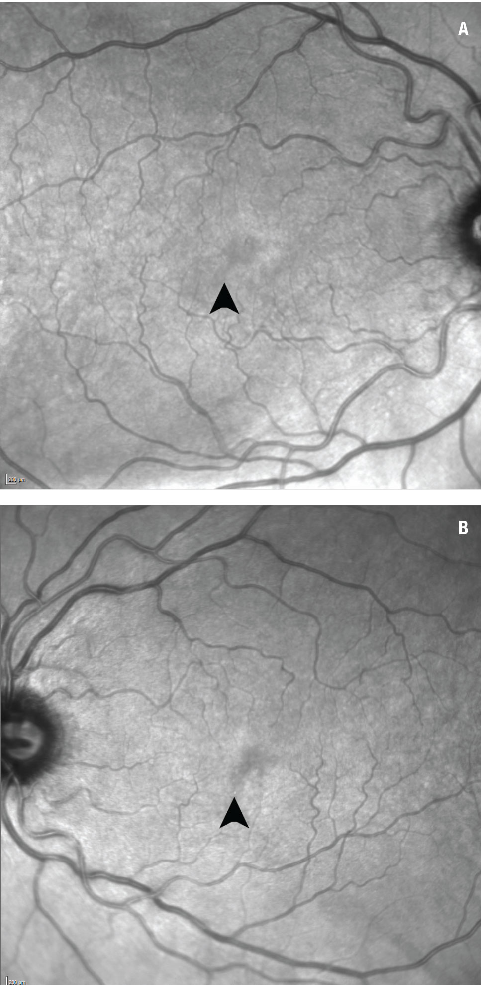 | Figure 3. Near-infrared reflectance shows a focal area of hypo-reflectance in the inferotemporal fovea of the right eye (A) and the inferonasal fovea of the left eye (B) (arrows). |