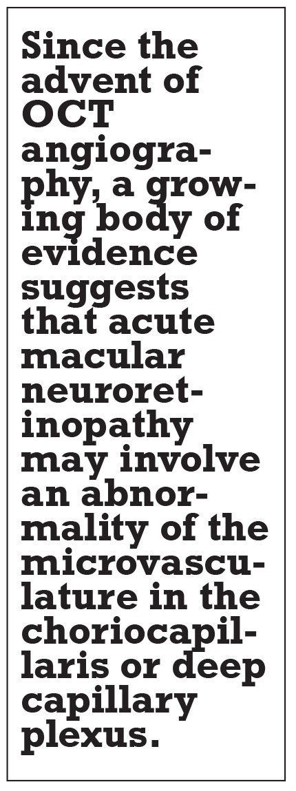 Acute macular neuroretinopathy was first described 45 years ago by Pierre J.M. Bos, MD, and August F. Deutman, MD.1 A subsequent large review of AMN found the typical demographic to be young women in their late 20s, with about half of cases having bilateral ocular involvement.2