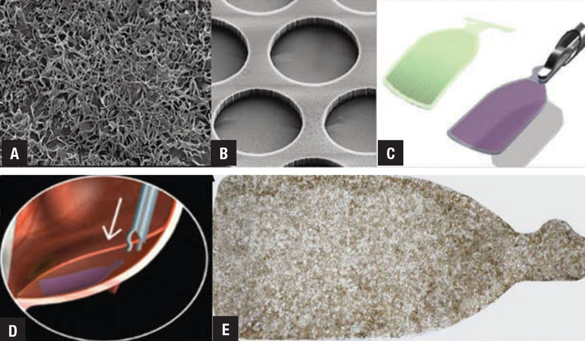 | Five views of the CPCB-RPE1 implant: A) mature retinal pigment epithelium cells on the implant; B) the parylene membranes used as a scaffold to support the RPE cells; C) a rendering of the delivery tool along with the implant showing how the tools grasp and compact the implant for delivery; D) a rendering of implant delivery into the subretinal space of the eye; E) a magnified view of the actual implant. (Image courtesy of Regenerative Patch Technologies). |