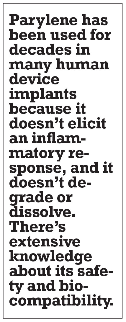 A: Parylene is a bioinert substance with a US Pharmacopeia Class VI rating for medical grade safety. It has been used for decades in many human device implants because it doesn’t elicit an inflammatory response, and it doesn’t degrade or dissolve. There’s extensive knowledge about its safety and biocompatibility.