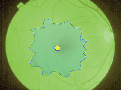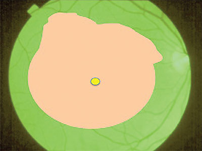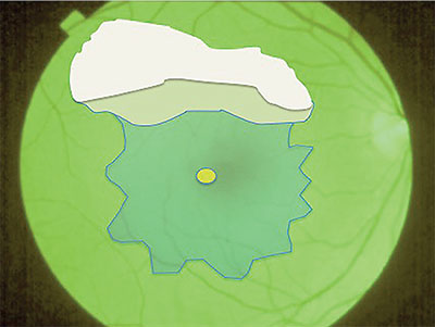 | Figure 1. With infusion pressure lowered, apply “heavy” indocyanine green stain to cover the entire macula. Allow it to settle for 10 seconds then remove, leaving a robust green staining of the internal limiting membrane and negative staining of the epiretinal membrane complex. |
