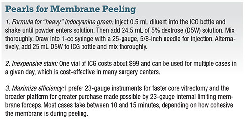 The simple technique I’ve outlined here is effective for removing most ERMs and can be applied with any gauge surgery and with any vitrectomy system. We have not experienced safety issues with “heavy” ICG at our institution, and it has been cost-effective for our surgery center. RS