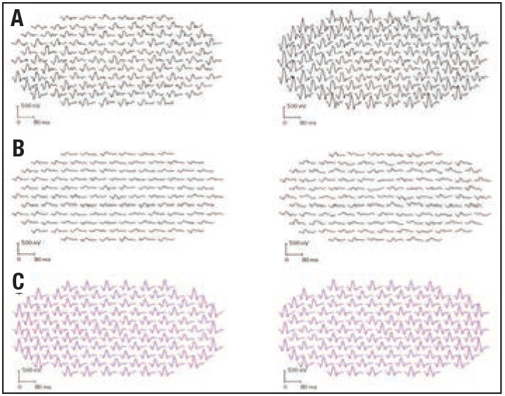 Figure 2. Multifocal electroretinogram (mfERG) of patient one (A) and patient two (B) both show reduced amplitudes suggestive of decreased retinal function, more pronounced in patient two. C shows a normal mfERG for comparison. |