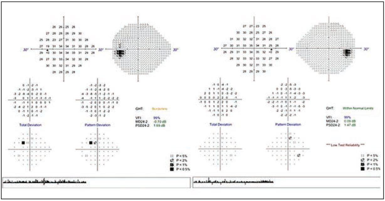 Figure 4. On initial screening, Humphrey visual fields of patient two demonstrate minimal changes. |