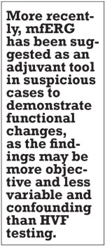 More recently, mfERG has been suggested as an adjuvant tool in suspicious cases to demonstrate functional changes,8 as the findings may be more objective and subject to less variation and confounding factors than HVF testing. Indeed, the cases we present here illustrate the utility of mfERG in management of HCQ toxicity.