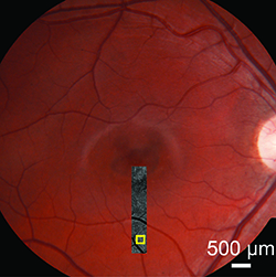 | Figure 1. Adaptive optics scanning laser ophthalmoscopy montage of the inferior meridian overlaid on the fundus photograph of the right eye of a teenage boy with macular atrophy due to Stargardt’s disease. The peripheral macula appears clinically unaffected. The yellow box indicates an area shown at higher magnification in Figure 2. |