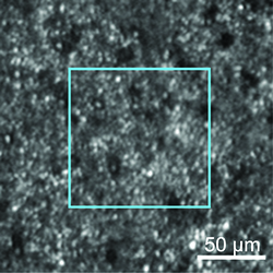 | Figure 2. AOSLO image of the cones and rods in the inferior macula, of the area indicated in Figure 1. The photoreceptor mosaic is continuous, but both cones and rods are enlarged, and “dark cones” are present. The blue box indicates an area shown at higher magnification in Figure 3 (below). |