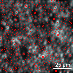 | Figure 3. Cone and rod labeling in the AOSLO image of the area indicated in Figure 2. x = cones, • = rods. |
