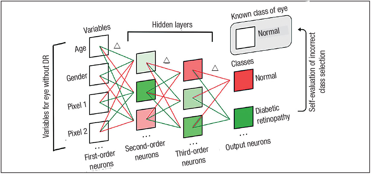 | Figure 1. A model neural network model showing incorrect class selection and subsequent weighted connection modifications.1 A neural network is composed of multiple neuronal layers. The first-order neurons represent clinical variables for an eye without diabetic retinopathy. Weighted connections are represented as positively weighed (green) or negatively weighted (red) lines. The second- order and third-order neurons comprise the hidden layers. The algorithm has output a class selection of “diabetic retinopathy,” which is incorrect. The algorithm compares the output of “diabetic retinopathy” to the known class of the eye, “normal.” Since the output was incorrect, the algorithm determines which weighted neuronal connections to modify (indicated by Δ). (Used with permission of Wolters Kluwer Health) |